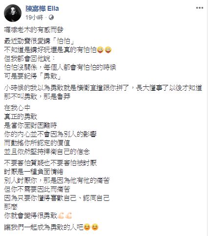 Ella正能量爆棚的貼文曝光後,引起大票網友的共鳴,紛紛留言:「最近看妳的發文都領悟好多」、「真的認同自己和懂得喜歡自己,就是最勇敢的表現」、「看了姐姐的文章好有感觸」、「好棒的一段話」、「好溫暖的文章」、「一起成為勇敢的人」。