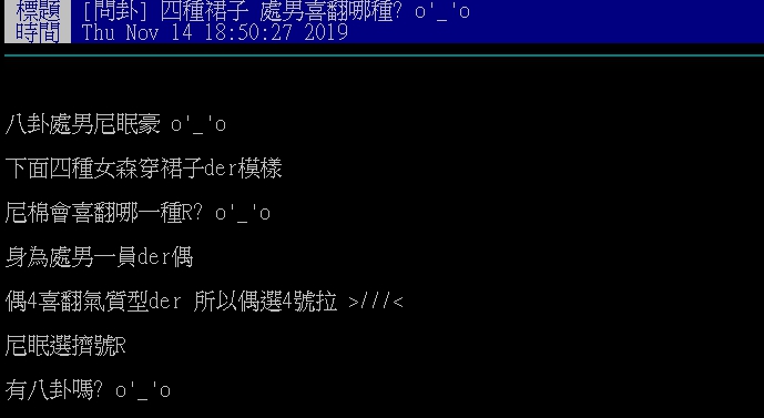 日前就有網友在PTT發文,貼出4張正妹穿著不同裙子的照片,詢問「處男最喜歡哪一種」