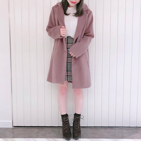 第一張的女孩打扮得相當青春洋溢,長大衣配上膝上裙,露出白嫩的大腿,相當可愛。