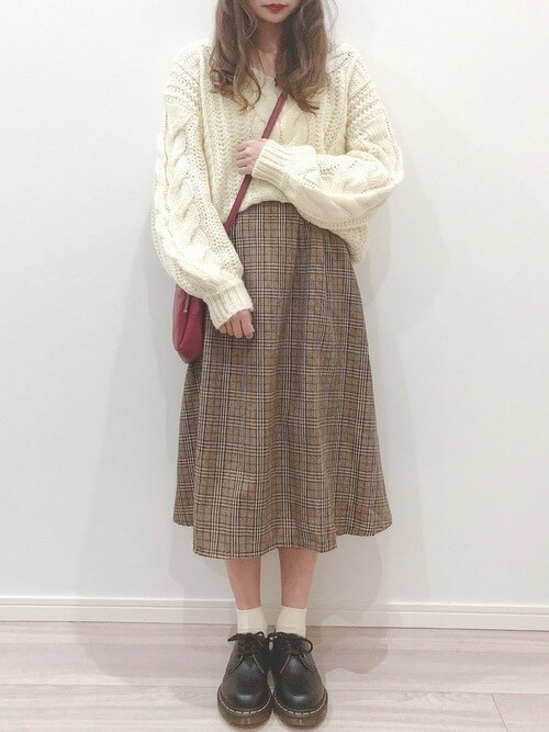 第二張中的女孩穿著白色的毛衣配上一件格紋長裙,穿著打扮相當文青、有氣質。