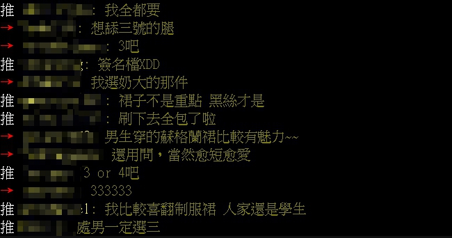 對此自稱處男的鄉民們紛紛留言表示,「裙子不是重點,黑絲才是」、「想舔三號的腿」、「3真的遠勝」、「3 因為有黑絲贏一半」、「3,4 很多男人一看就跟餓鬼一樣狂抓」、「可以看到大腿的都好」、「小孩子才做選擇 通通包軌」。