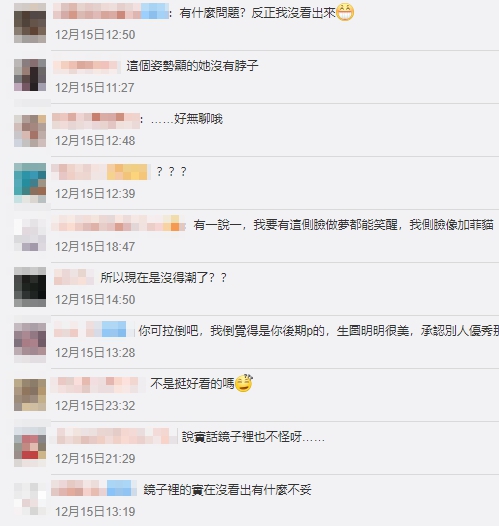 不少網友看見照片後,紛紛認為是修圖沒修好,才會導致人跟倒影有差異,「她的修圖終於失誤了」、「這個姿勢顯得她沒有脖子」、「鏡子裡反射出的角度好奇怪啊」;但也有人認為,只是角度及拍攝手法的問題,「有什麼問題?反正我沒看出來」、「鏡子裡的人物本來就會稍微變化一點」、「我看了半天也沒看出鏡子裡有什麼奇怪」、「因為鏡子反過來,往右靠當然那邊就會顯得脖子胖啊」。