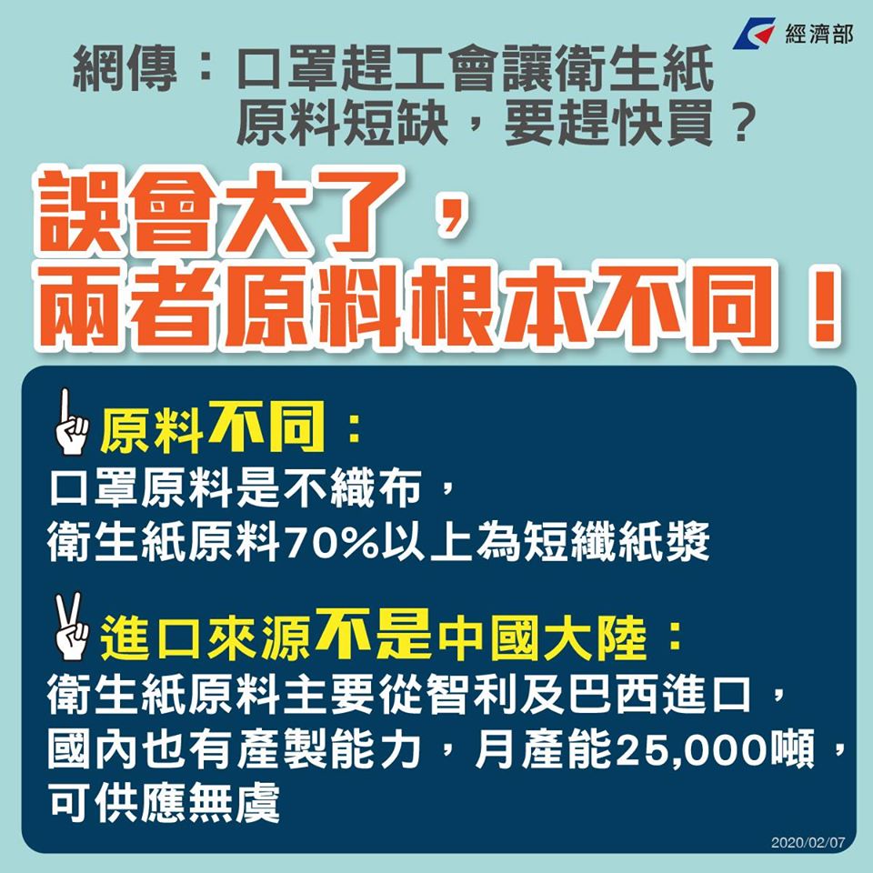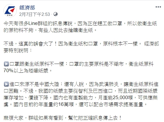 對此,經濟部火速在臉書發文澄清,表示「真的誤會大了」,並解釋口罩跟衛生紙原料其實不一樣,口罩的主要原料是不織布,衛生紙原料有70%以上是短纖紙漿,呼籲民眾切勿恐慌,同時希望網友能幫忙把正確訊息分享出去。