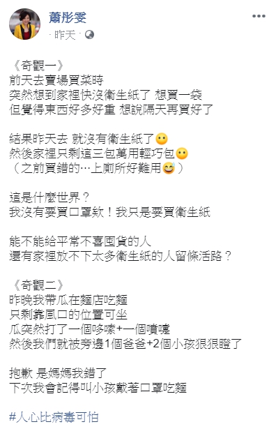 前主播蕭彤雯8日在臉書發文,開頭以「奇觀」描述自己遇到的情況,「前天去賣場買菜時,突然想到家裡快沒衛生紙了想買一袋,但覺得東西好多好重,想說隔天再買好了,結果昨天去就沒有衛生紙了,然後家裡只剩這三包萬用輕巧包」,她接著表示,自己要購買的不是口罩,而是衛生紙,為何會這麼難買?隨後她也無奈向網友表示,「能不能給平常不喜囤貨的人,還有家裡放不下太多衛生紙的人留條活路?」