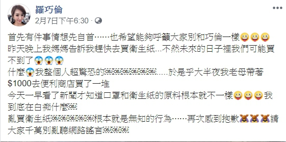 而女星羅巧倫也透露,前幾天得知衛生紙將缺貨,便與母親一起到便利商店囤貨,沒想到正確新聞出來,才驚覺自己被誤導,文章也引起大批網友留言,「真的還是要以新聞報導為主」、「真的人心惶惶」、「網路上的謠言別亂信喔!」、「做人還是要理智一點好」、「經一事!長一智!沒事沒事!」,最後羅巧倫也強調,千萬別輕易聽網路謠言。