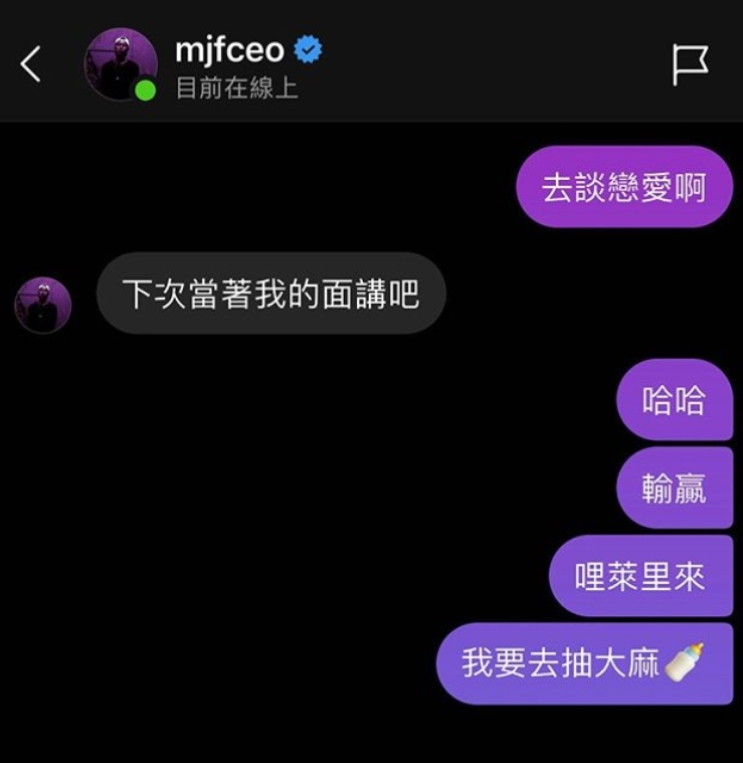 昨(27)日謝和弦在IG貼出與瘦子的對話截圖,從畫面中可以看到,謝和弦要對方去談戀愛,瘦子則回覆,「下次當著我的面講吧」,不過接下來謝和弦就表示,「輸贏!哩萊里來(你來你來)!我要去抽大麻。」
