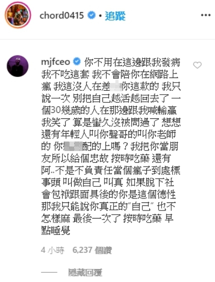 事隔13小時後,瘦子在該則貼文留下自己的想法,「你不用在這邊跟我發病,我不吃這套,我不會陪你在網路上瘋,我這沒人在XX你這款的」,瘦子接著開始勸導謝和弦,「30幾歲的人在那邊跟我喊輸贏,我笑了,算是蠻久沒被問過了,想想還有年輕人叫你聲哥的、叫你老師的,你X的配得上嗎?」
