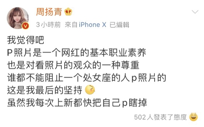 周揚青首先表示,她認為P照片是一個網紅的基本職業素養,也是對看照片的觀眾尊重,最後幽默的將原因歸為星座問題「誰都不能阻止一個處女座的人P照片」,許多網友也紛紛留言表示「你想P的話你就P吧!我都愛」、「處女座真的很細緻」。
