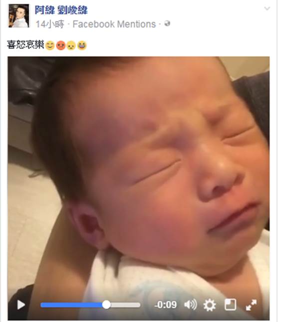 藝人阿緯 (劉峻緯)去年7月與交往4年的千金女友豆豆結婚,並且在同年12月喜獲愛女「錢錢」,而升格當爸爸後的他,不但經常在臉書曬愛女的萌照,還會分享家庭的甜蜜趣事,昨(5日)他在臉書PO出女兒26秒內做出標準「喜怒哀樂」的影片,呆萌的表情讓不少網友的心都融化了,直喊「也太可愛了吧!」