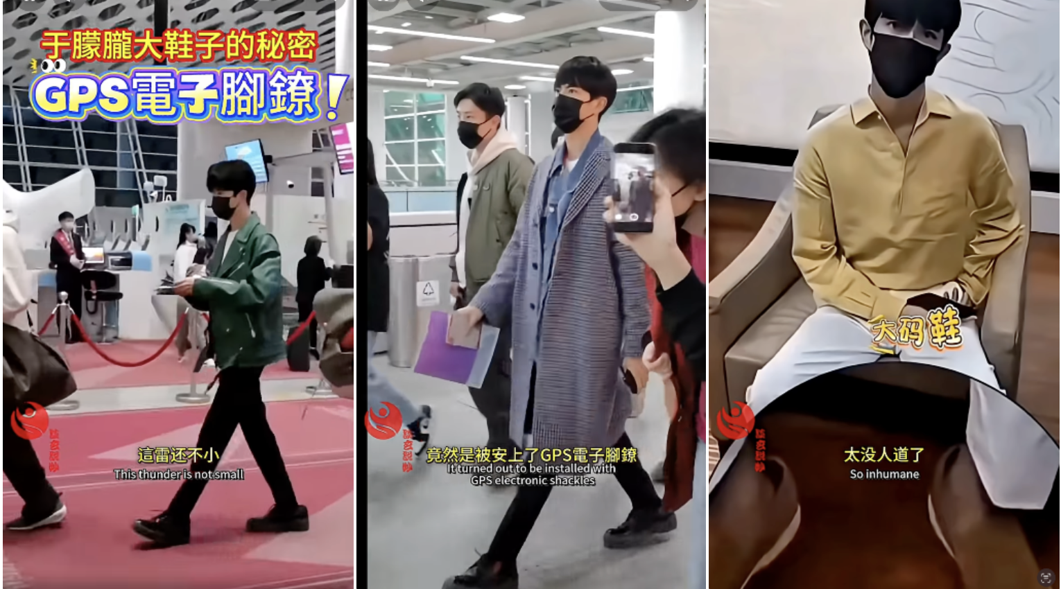 此外,部分網友也翻出于朦朧過往照片,稱他多次穿著尺寸明顯偏大的鞋子,質疑可能是因為被強迫配戴 GPS 電子追蹤裝置才需穿大碼鞋款。另有傳言指稱,于朦朧的部分代言鞋款遭他人拿走,導致他在工作期間穿著並不合腳的鞋子。