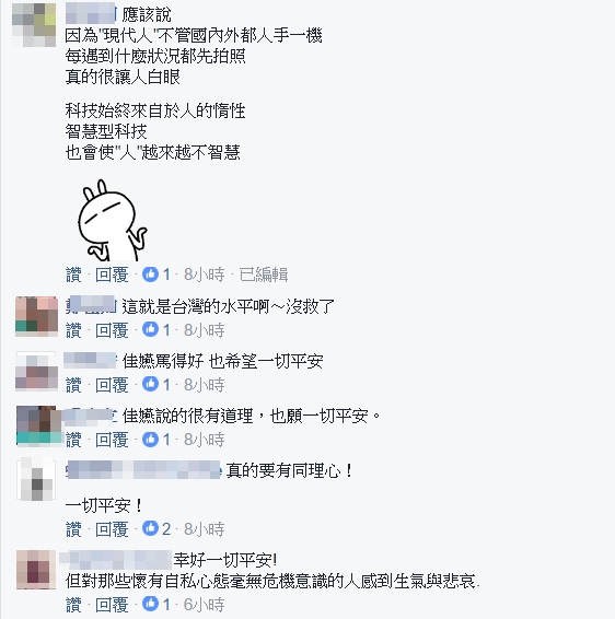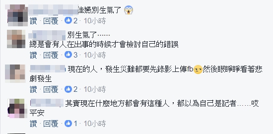 對此,網友紛紛留言要柯佳嬿「別生氣」,也紛紛表示同意:「總是會有人在出事的時候才會檢討自己的錯誤」、「現在的人,發生災難都要先錄影上傳FB,然後眼睜睜看著悲劇發生」、「其實現在什麼地方都會有這種人,都以為自己是記者」、「科技始終來自於人性,智慧型科技,也會使人越來越不智慧」、「對那些懷有自私心態毫無意識的人感到悲哀」。
