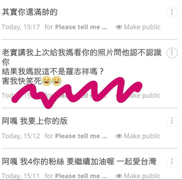 最近有不少人都在自己的Instagram放上sayat.me程式的聯結,讓粉絲、好友們可以匿名傳達對你的想法,也可以趁機說出平常不好意思說的話。日前蔡阿嘎就有收到不少粉絲的匿名訊息,有粉絲稱讚他「其實你還滿帥的」,也有人給予鼓勵「阿嘎,我4你的粉絲,要繼續加油喔,一起愛台灣」,其中還有一個留言讓他樂翻了。