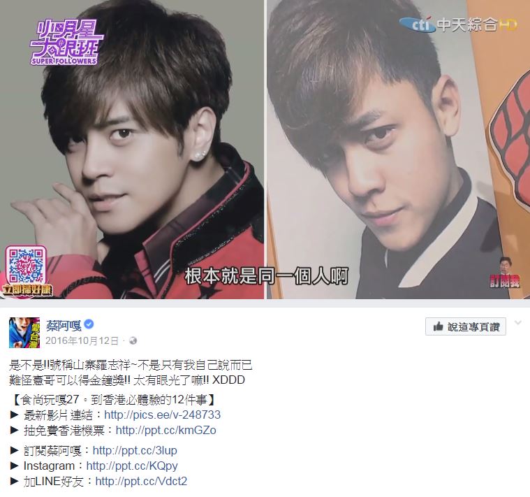 其實先前蔡阿嘎就曾號稱自己是「山寨羅志祥」,有一次他的側臉自拍照被拿到節目上和羅志祥做比較,讓主持人吳宗憲和來賓都驚呼「超像的」!