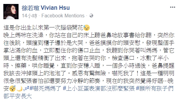 藝人徐若瑄和新加坡富商李雲峰結婚三年,育有一子小V寶,時常在臉書上曬出與小V寶的合照及生活點滴,看得出婚後生活十分充實。不過昨(21日)徐若瑄在臉書上透露,寶貝兒子在家竟受傷「腦袋開花」,幸好敷藥後已無大礙,但恐怖經歷還是讓她直呼「上小巨蛋表演都沒那麼緊張」!