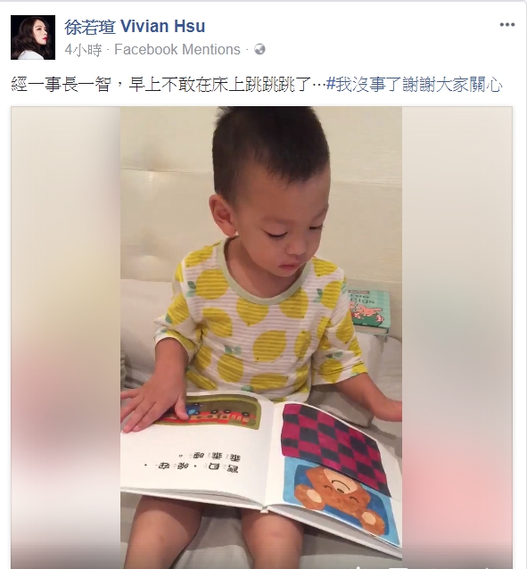 今(22日)徐若瑄還PO出了小V寶看著故事書的一段影片,並表示「經一事長一智,早上不敢在床上跳跳跳了」,因為昨晚粉絲相當擔心徐若瑄的心情,徐若瑄也特地向大家報平安,並謝謝大家對她的關心。