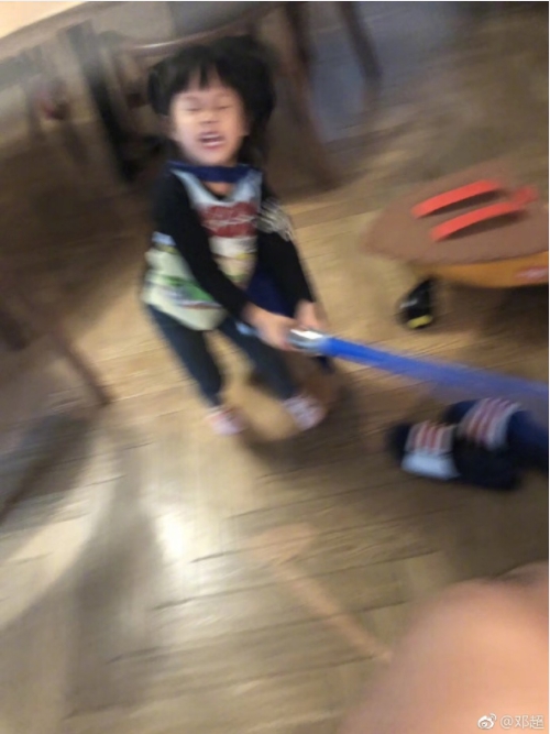孫儷與鄧超經常會在微博上互虧對方,引起眾多網友關注,鄧超27日難得在微博曝光女兒的正面照片,小花頂著俏皮瀏海,穿長袖T恤以及黑色長褲,手裡握著一根細長的藍色棍棒揮舞著,表情則猙獰搞怪,五官全擠在一起,模樣逗趣又可愛,儘管畫面搖晃模糊,小花雙眼緊閉,但仍有不少網友直呼「長得好像孫儷」。