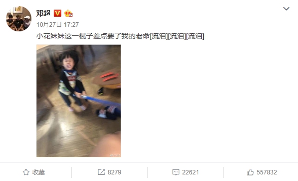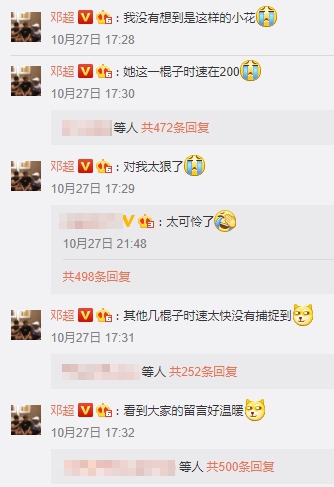 網友不停的讚美小花模樣可愛又討喜,鄧超卻無奈表示「小花妹妹這一棍子差點要了我的老命!」隨後附上數個淚流滿面的表情符號,還向網友討拍,直呼「我沒有想到是這樣的小花」、「對我太狠了」,並開玩笑的說「這一棍子時速在200」,而且小花還不只揮了一棍,「其他幾棍子時速太快,沒有補捉到」,一連串發言讓人笑翻。