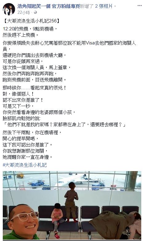 「浩角翔起」中的浩子去年宣布暫時退出演藝圈,現今帶著妻小環遊世界,常在臉書上分享旅遊趣聞,但昨(4)日卻在臉書透露,一名海關將他們請到機場大廳,雖然後來順利通關,但已經趕不上飛機,全家人只能眼睜睜看著飛機飛走,讓浩子一度爆氣想發火,但當他轉頭看到妻小的臉龐,便轉念「家都帶在身上了!」隨即收起情緒,正能量被網友讚翻。