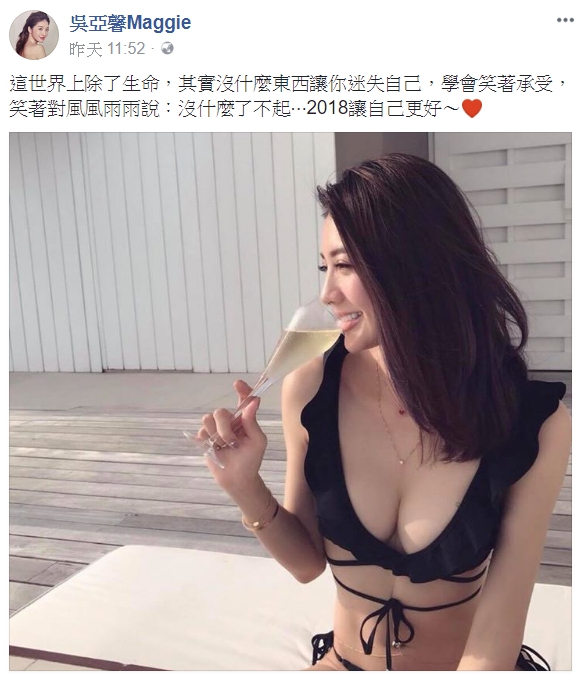 吳亞馨昨(3日)在臉書上Po出一張辣照並表示,世界上沒有什麼東西能讓自己迷失,因此學會笑著面對風風雨雨,在任何打擊迎面而來時,她都自我砥礪,告訴自己那些挫折「沒什麼了不起」,接著,她許下2018年的新希望,就是能「讓自己更好」。