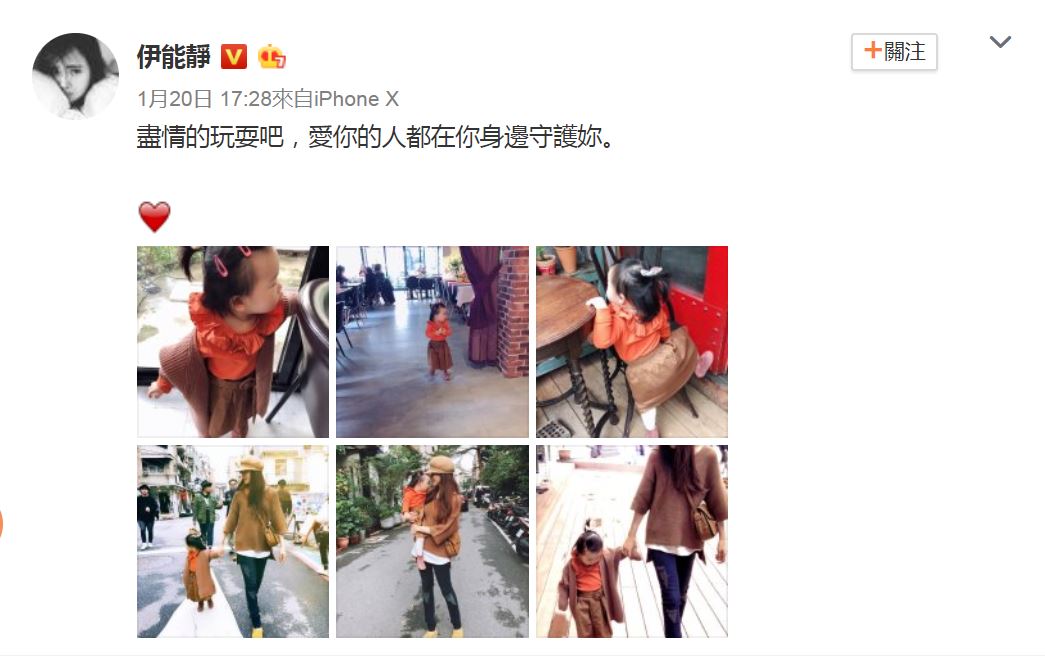 伊能靜20日傍晚在微博發文分享她帶著小米粒外出逛街的照片,並在貼文中表示,「盡情地玩耍吧,愛妳的人都在妳身邊守護妳。」可愛又溫馨的畫面,讓不少人看了紛紛留言,除了稱讚小米粒漸漸長大,越來越可愛,也有人送上祝福,希望伊能靜和秦昊一家能夠幸福。