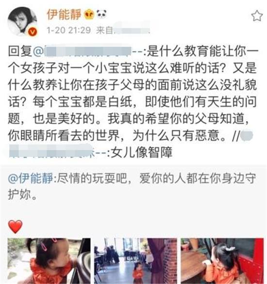沒想到卻有一名網友留下惡意評論,直呼「女兒像智障」,看到寶貝女兒無端遭受攻擊,伊能靜忍不住公開回嗆對方:「是什麼教育能讓你一個女孩子對一個小寶寶說這麼難聽的話?是什麼教養讓你在孩子父母的面前說這麼沒禮貌的話?每個寶寶都是白紙,即使他們有先天的問題,也是美好的,我真的希望你的父母知道,你眼睛所看去的世界,為什麼只有惡意。」