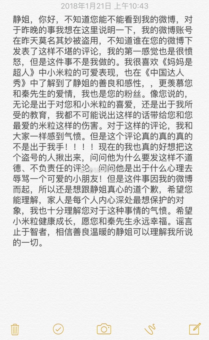不少人看到之後也紛紛力挺伊能靜,要她別和酸民計較,同時也要求留下該言論的人道歉,而伊能靜隨後便將該篇文章刪除。不過21日伊能靜再度PO文透露,惡意留言的該帳號有做出回應,對方聲稱先前是遭盜帳號才會出現該留言,並表示自己對於這樣的言論也很不認同,希望伊能靜能理解。