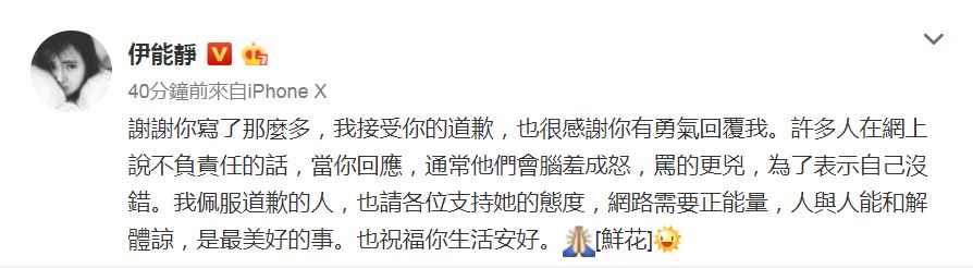 而伊能靜則轉發對方的聲明,表示「我接受你的道歉,也很感謝你有勇氣回覆我。許多人在網上說不負責任的話,當你回應,通常他們會腦羞成怒,罵的更兇,為了表示自己沒錯。」並指出網路需要正能量,人與人能和解、體諒,是一件美好的事,希望事情到此為止。