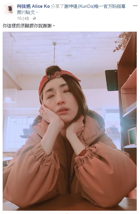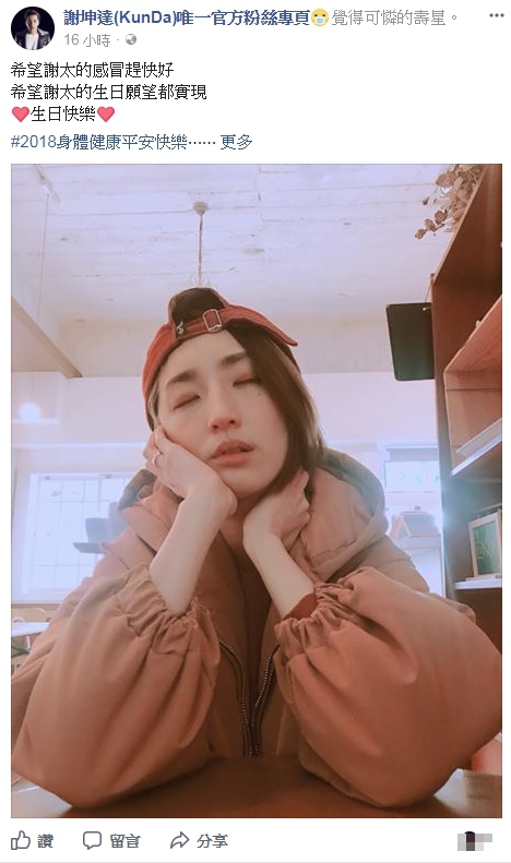 昆達在臉書上貼文表示,「希望謝太的感冒趕快好,希望謝太的生日願望都實現」,並且曬出謝太太的睡顏,從照片中可以看到,柯佳嬿反戴棒球帽,穿著厚外套保暖,一手撐在臉頰旁邊,一手扶著脖子,雙眼緊閉,鼻頭看起來有些紅紅的,似乎是因為近期溫差變化大,染上了感冒,看起來相當不舒服。而這樣的情況,看在老公坤達眼裡可說是萬般不捨,但心疼之餘也不忘捉弄老婆,雖然甜喊「妳好我就好」,但柯佳嬿似乎難買帳,她轉發貼文簡短表達心情,「你這樣我很難跟你說謝謝」。