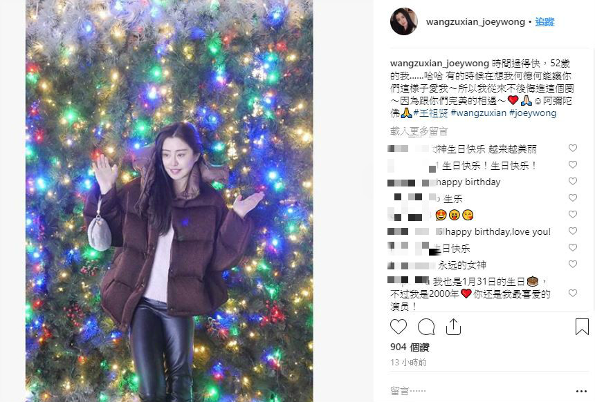 王祖賢雖淡出演藝圈多年,仍擁有許多死忠粉絲,她也時常透過社群網站和粉絲們分享生活點滴。31日正好是王祖賢生日,她在Instagram上發文,感嘆時光飛逝,自己也將邁入52歲,隨後感性吐露心聲:「有的時候在想我何德何能讓你們這様子愛我~所以我從來不後悔進這個圈~因為跟你們完美的相遇~阿彌陀佛」,直言不後悔進入演藝圈,只見照片中的王祖賢,身穿羽絨外套搭配黑色皮褲,狀態維持的相當良好,臉上也絲毫沒有看見歲月下的痕跡,年過半百的她美麗依舊。