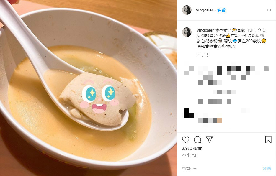 因為疫情關係,夫妻倆行事變得低調,鮮少在社群網站放閃,不過應采兒昨日難得曬出陳小春親自煲的「愛心湯」,透露老公在調味時習慣多加一些白胡椒粉,據說因此買了港幣200元(約773元新台幣)的白胡椒粉,讓她幽默表示:「不知道喝完會不會讓母乳多一點?」