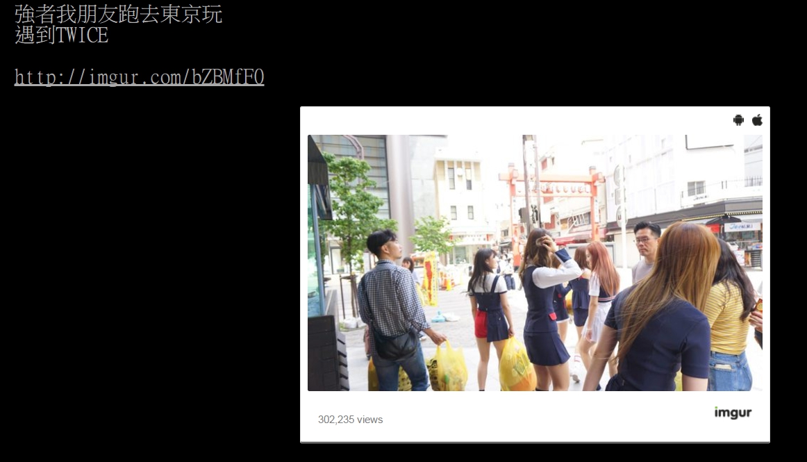 網友在《PTT》上以「我的老婆跑去淺草」為題,PO出兩張照片,只見周子瑜和團員們聚在一起,除了工作人員外,還有不少粉絲圍觀,網友開心分享「朋友跑去東京玩,遇到TWICE,剛好在淺草的朋友們有福了」。