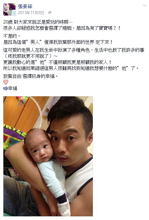 其實這對夫妻原本是甜甜蜜蜜的,2013年8月兩人喜獲麟兒,同年11月8日,張晏菻還在粉絲團上留下了「放棄自由」宣言,他說自己會走入婚姻不是因為有了小孩,而是因為會疼她、照顧她的林佑星,「這可愛的老男人在我生命中扮演了多種角色,生活中也教了我許多的事(疼我那就更不用說了)~更讓我動心的是『他』不僅照顧我更是照顧我的家人!所以我知道如果錯過這男人很難再找到知道我想要什麼的『他』了。」此舉,讓林佑星相當感動。對照現在的「想自由」,不免讓人疑惑,難道真的回不去了嗎?