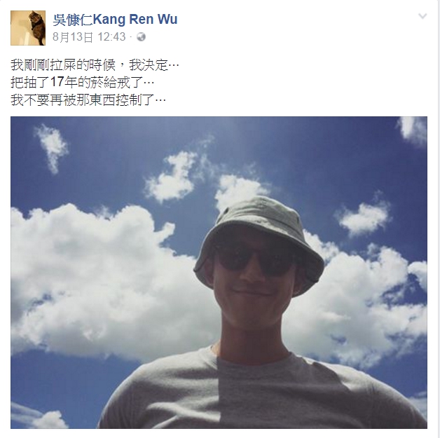 ▼吳慷仁在臉書上宣布要戒菸(圖/吳慷仁臉書)