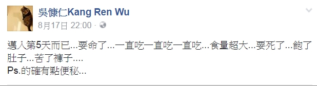 8月13日吳慷仁在臉書上宣布要戒掉17年的菸癮,戒菸才過5天,他又在臉上po文說「邁入第5天而已...要命了...一直吃一直吃一直吃...食量超大...要死了...飽了肚子...苦了褲子....」透露他為了克制菸癮,靠吃東西來發洩,戒菸短短的幾天,就胖了6公斤。9月3號,吳慷仁更直接放上站在體重計上的照片,體重已經來到81公斤,比去年走金鐘紅毯的57公斤,整整多出了24公斤。