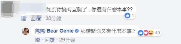 不過這則貼文卻也引來網友批評,該則留言指出「知到(道)你擁有巨胸了,你還有什麼本事??」而熊熊看到後也不甘示弱,直接在留言回覆對方「那請問你又有什麼本事?」其他粉絲看到後也紛紛聲援熊熊,撻伐留言者的酸言酸語。
