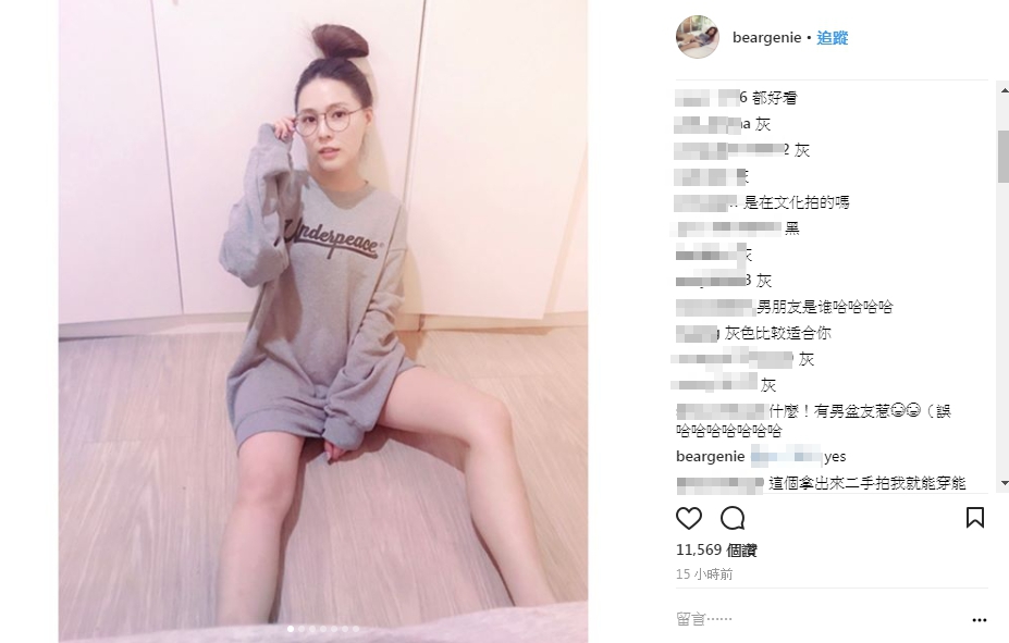 從熊熊貼出的照片中可以看到,她綁著俏麗包頭,帶著圓框眼鏡,身上穿著寬大灰色的長版上衣,坐在地上拍照,下半身看起來像沒穿,露出白皙美腿,左手還因此巧妙地拉住衣服下擺微遮神秘地帶,雖然跟以往直接大秀比基尼照相比,這次明顯保守許多,但魅力依然不減。