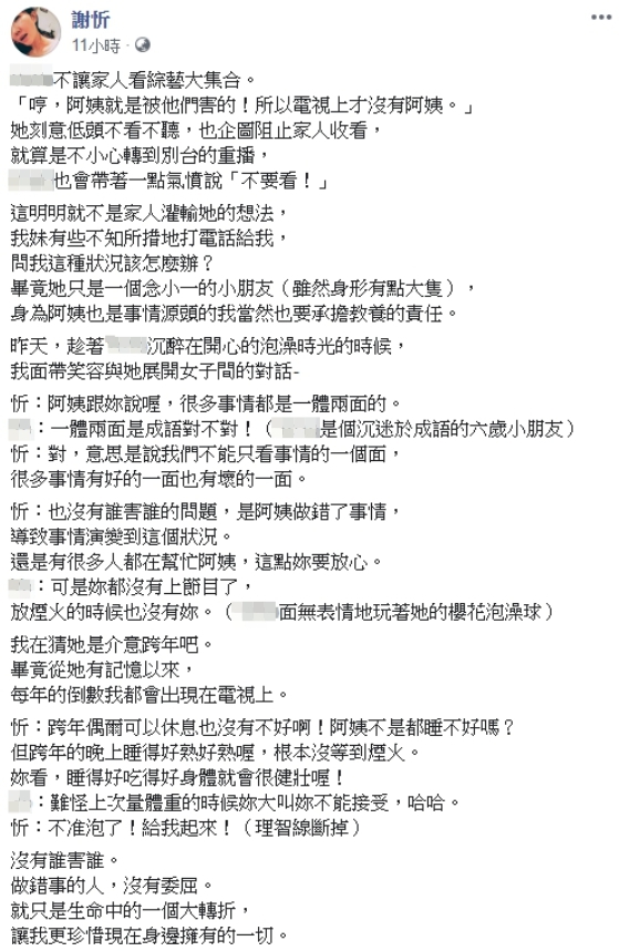 為了說服外甥女,謝忻換個角度告訴她,偶爾可以在跨年時好好休息也不錯,這樣身體也會比較健壯,沒想到外甥女藉此取笑謝忻因此變胖,2人就這樣打鬧著結束對話。謝忻在文章後正面反省道:「做錯事的人,沒有委屈。就只是生命中的一個大轉折,讓我更珍惜現在身邊擁有的一切。」對於這段時間以來的紛紛擾擾,似乎已經較為釋懷。