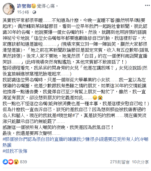 許聖梅在臉書PO文表示,難得轉到綜藝節目,看到一位早年一起跑社會新聞的名嘴,在節目上說要爆一個女名嘴的料,還用誇張的語調神祕兮兮地說,女名嘴除了每年都要「進廠維修」之外,而且原來是某政論節目固定來賓的她,被開除後還「白目」在便利商店開直播哭訴。