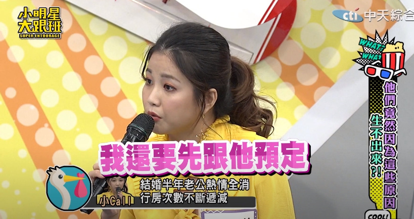 小Call在節目《小明星大跟班》分享夫妻倆閨房事,指出跟上班族老公「寶先生」剛結婚時,雙方興致都相當高昂,但沒想到僅過了半年,對方就不再熱情,次數慢慢遞減,直到現在平均一個月一次,而那一次還是得在小Call算好危險期、排卵期,提前3天預定,讓小Call直呼行房就像只是為了懷孕。