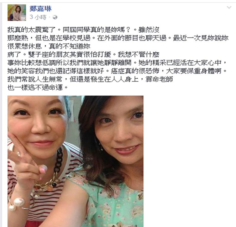 鄭嘉琳也在臉書PO文表示:「我真的太震驚了。同屆同學真的是妳嗎?雖然沒那麼熟,但也是在學校見過、在外面的節目也聊天過。最近一次見妳說妳很累想休息,真的不知道妳病了。雙子座的朋友其實很怕打擾……我們常說人生無常,但還是發生在人人身上,算命老師也一樣逃不過命運。」而曾與她合作節目《命運好好玩》中的郭靜純、何篤霖等人,對於薇薇安近況都表示:「不太清楚!」,如今傳出癌逝的消息,粉絲們都替她集氣,希望只是巧合。