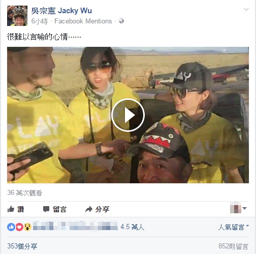 吳宗憲的自拍影片中,只見他坐在床上眉頭身鎖,下方秀出影片字幕「從台北、肯亞、紐約、波士頓、北京,飛著飛著,心都不知道飛到哪裡了」、「走了30年的路,卻感覺迷路了」,背景襯著昔日張艾嘉歌曲《愛的代價》唸詞和音樂:「只有在你因為愛而付出的時候,你會是快樂的。」、「走吧走吧,為自己的心找一個家、走吧走吧,人生難免經歷苦痛掙扎直…也曾傷心流淚,也曾黯然心碎,這是愛的代價」。畫面中,吳宗憲甚至一度紅了眼眶,直到影片最後,寫下:「很難以言喻的心情……」